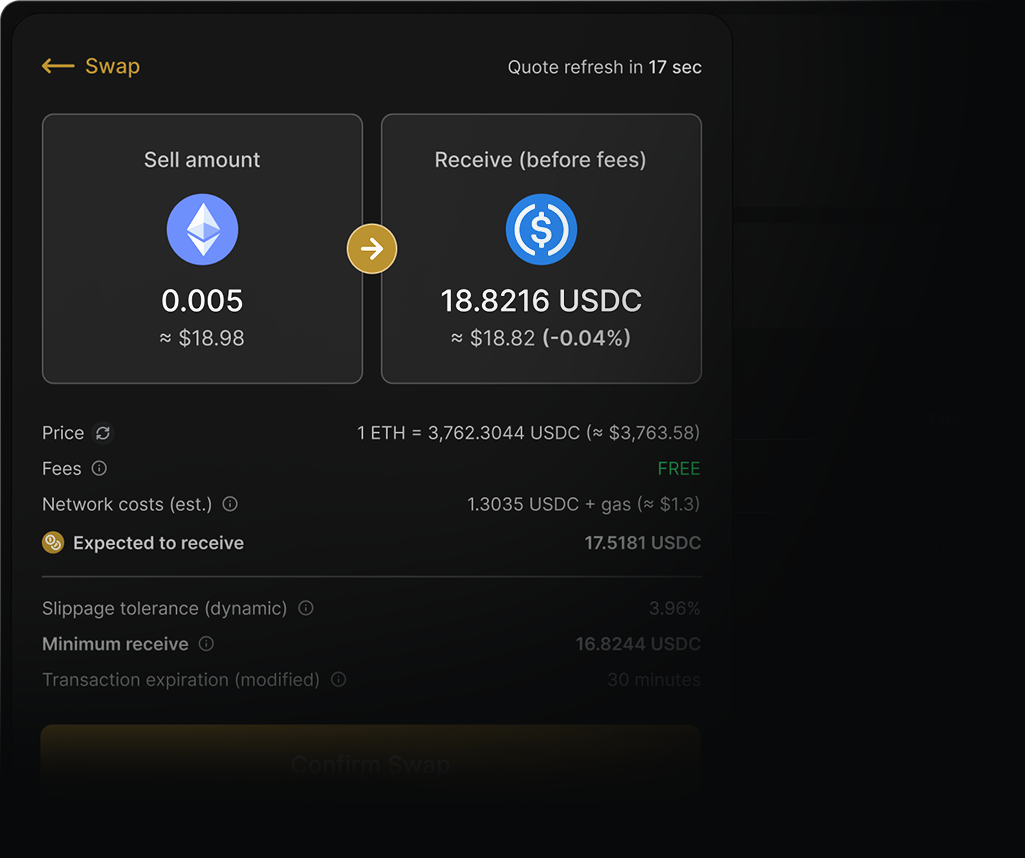 Effortlessly exchange digital assets across supported blockchains with CowSwap integration. Enjoy the best available rates, zero hidden fees, and full transparency, all powered by secure smart contracts.